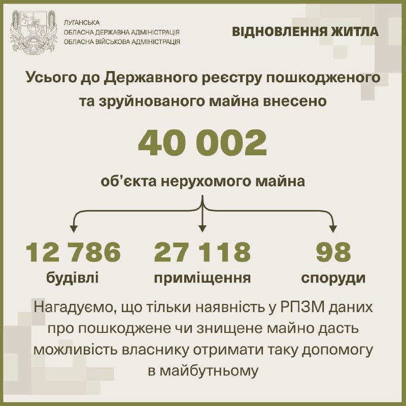 Усього до РПЗМ внесено 40 002 об’єкти нерухомого майна, у тому числі 12 786 будівель, 27 118 приміщень та 98 споруд.