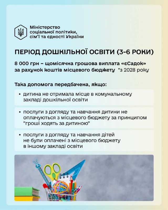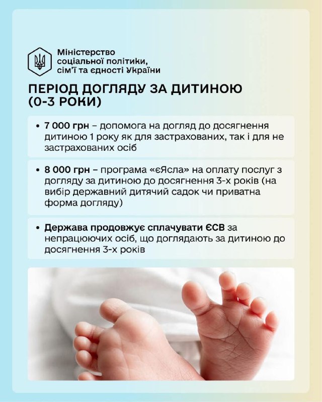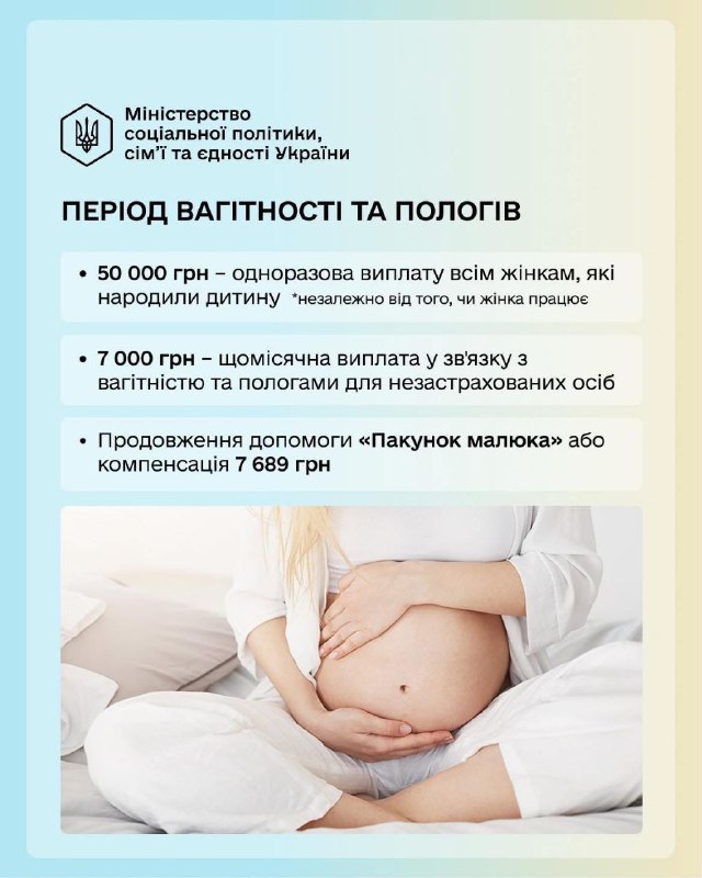 ▫️Допологова допомога для незастрахованих жінок – 7 тисяч грн. ▫️Одноразова виплата при народженні дитини – 50 тисяч грн. ▫️Щомісячна допомога по догляду за дитиною до 1 року – 7 тисяч грн, а для сімей, які виховують дитину з інвалідністю – 10,5 тисяч грн.
