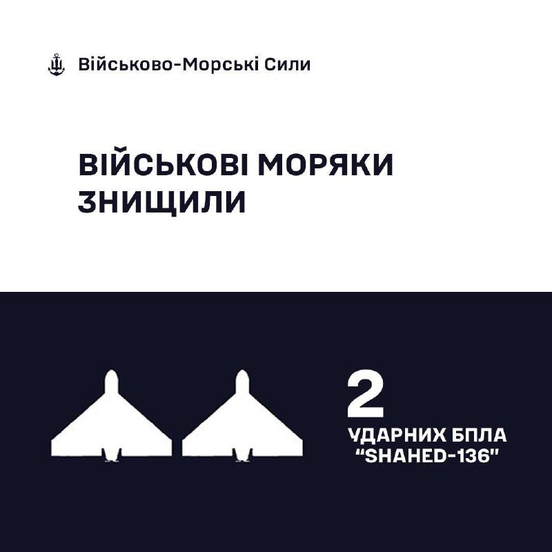 💥Сьогодні вранці під час повітряної атаки російських окупантів ВМС було збито 2 ворожі дрони-камікадзе "SHAHED-136".