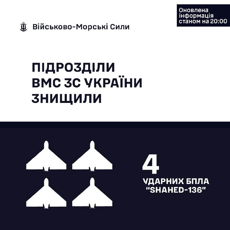 Впродовж доби силами та засобами Військово-Морських Сил Збройних Сил України було збито 4 ударні БпЛА типу "SHAHED-136".