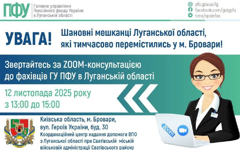 12 листопада з 13:00 до 15:00 у місцевому гуманітарному осередку Сватівської громади відбудеться онлайн-консультування з пенсійних питань від фахівця Головного управління Пенсійного фонду України в Луганській області.
