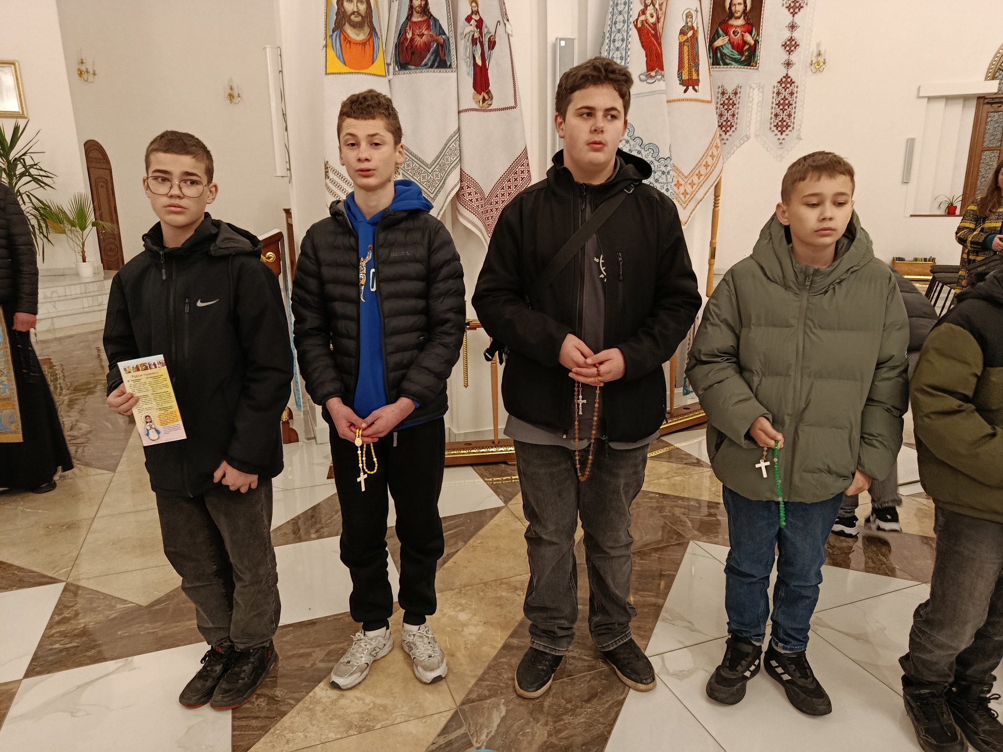 Після вечірньої Божественної Літургії діти спільно з о. Миколою Катричем, о. Тарасом Нейлюком та о. Назарієм Касієм провели спільну молитву на вервиці, розважаючи над Світлими Таїнствами.