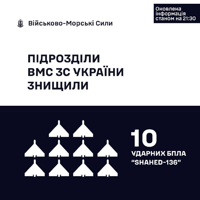 Сьогодні 16.11.2025 силами та засобами Військово-Морських Сил Збройних Сил України було збито 10 ударних БпЛА типу "SHAHED-136".