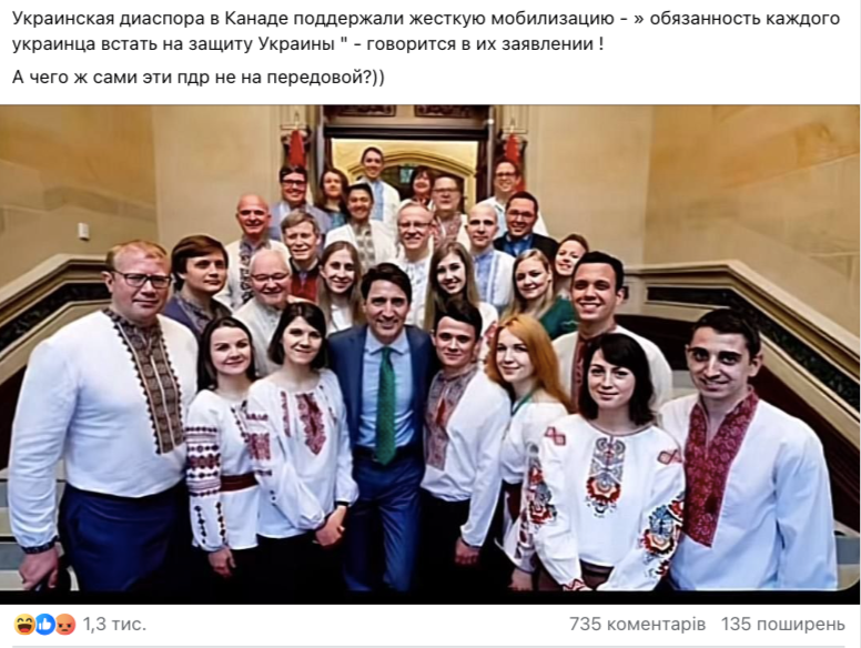 У проросійському сегменті мережі пошириюється новина про те, що діаспора українців в Канаді буцімто підтримала «жорстку мобілізацію» та заявила, що встати на захист батьківщини — обов’язок кожного українця. Очікувано, новина викликала хвилю кепкувань у російської аудиторії: лише одна з публікацій наразі зібрала в Facebook 1300 реакцій, а також більше 700 коментарів і 135 поширень.