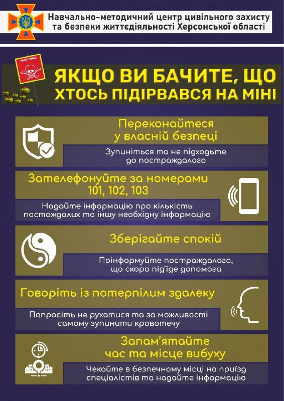 Якщо ви помітили людину з ознаками мінної травми, головне — не наближайтесь та не намагайтесь допомогти пораненому самотужки, інакше ви ризикуєте теж натрапити на міни.