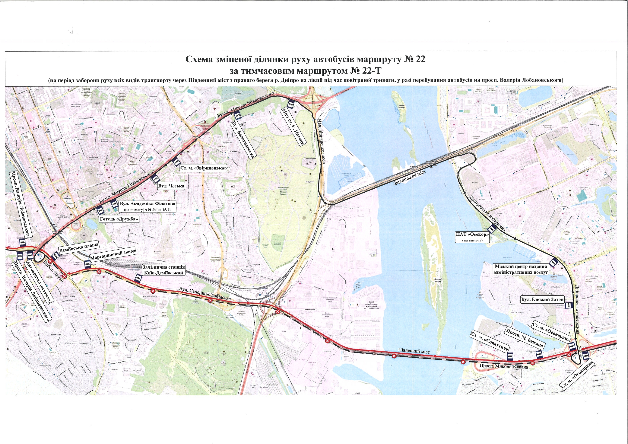 У зв’язку з цим, за інформацією Департаменту транспортної інфраструктури, під час повітряної тривоги та в разі, коли патрульна поліція запроваджує тимчасову заборону руху транспорту Південним мостом із правого берега Дніпра на лівий, автобуси № 22 та № 91 курсуватимуть за зміненими схемами.