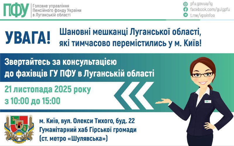 У п’ятницю в Києві на ваші запитання відповідатимуть луганські пенсійники 19.11.2025, Середа | 12:00 Автор допису: Голова Луганської обласної військової адміністрації У п’ятницю в Києві на ваші запитання відповідатимуть луганські пенсійники 21 листопада у хабі Гірської громади в Києві відбудеться прийом внутрішньо переміщених осіб фахівцем ГУ ПФУ в Луганській області. Звернутися можна буде з 10:00 до 15:00 за адресою: м. Київ, вул. Олекси Тихого, буд. 22 ( ст. метро «Шулявська»). Джерело Друк / PDF