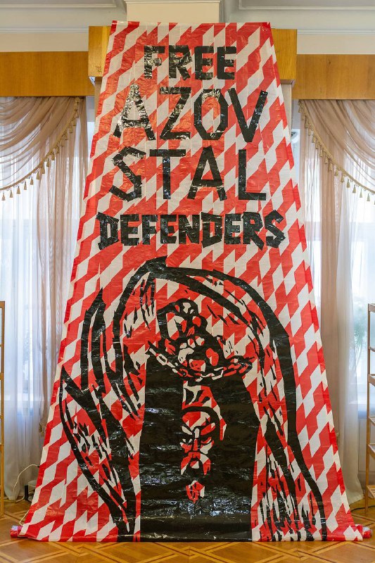 ☝️Виставку доповнює нова інсталяція Вальдемарта Клюзка, присвячена військовополоненим українцям, які досі перебувають у російських катівнях. Раніше плакат був представлений на акції у Києві та є закликом підтримувати заходи на підтримку військовополонених.