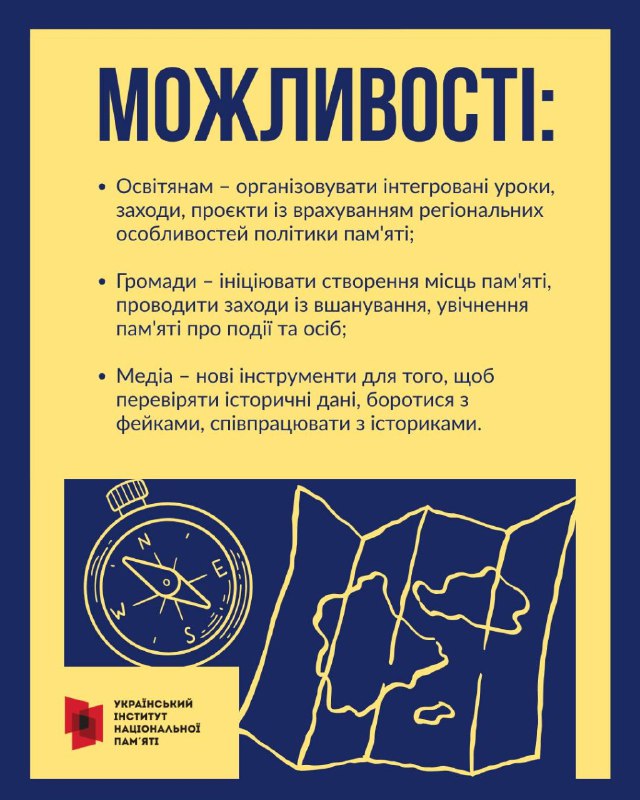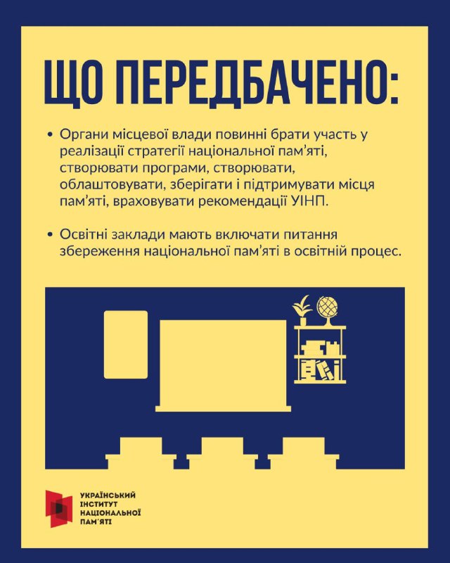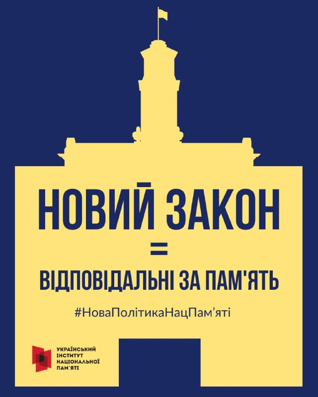 НОВИЙ ЗАКОН: ОБОВ’ЯЗКИ Й МОЖЛИВОСТІ Закон України «Про засади державної політики національної пам’яті… 24.11.2025, Понеділок | 16:22 Автор допису: Український інститут національної пам'яті НОВИЙ ЗАКОН: ОБОВ'ЯЗКИ Й МОЖЛИВОСТІ Закон України «Про засади державної політики національної пам’яті Українського народу» чіткіше розподіляє відповідальність за національну пам'ять. Більше деталей – у каруселі. Вже незабаром розкажемо простими словами про всі ключові зміни, що пов'язані із цим законом. Слідкуйте за серією #НоваПолітикаНацПамяті Джерело Друк / PDF