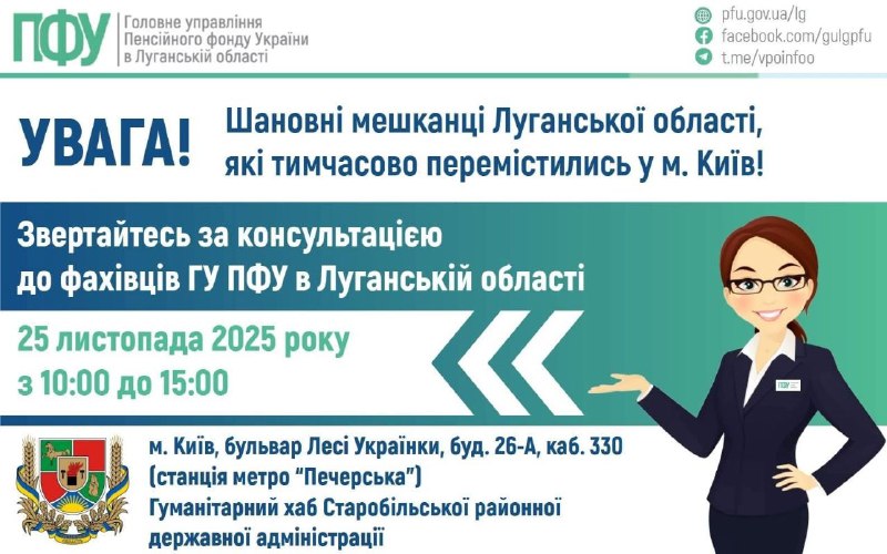 25 листопада у столичному хабі Старобільської РДА відбудеться прийом внутрішньо переміщених осіб фахівцем ГУ ПФУ в Луганській області.