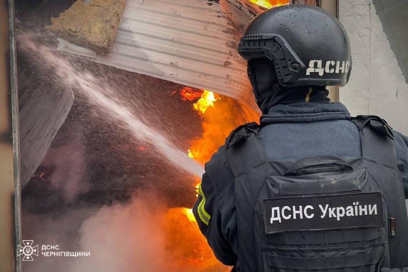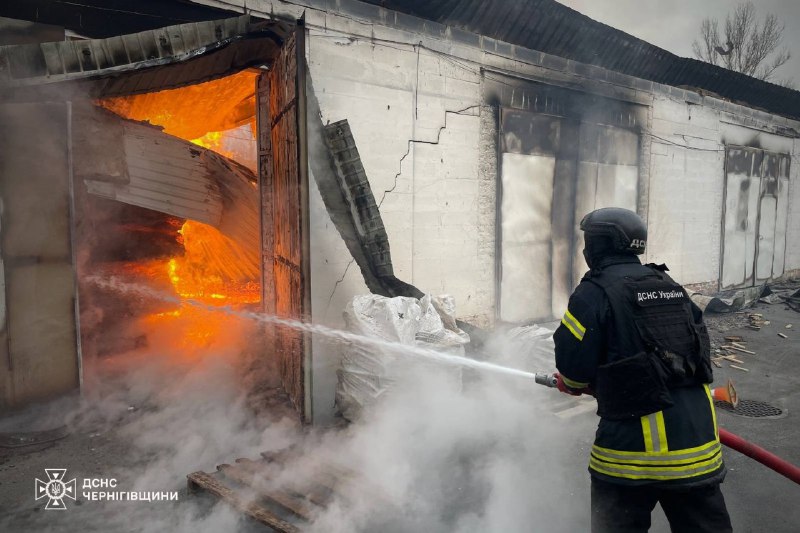 🔻У місті Корюківка виникла пожежа на території підприємства: загорілися ангари та склад готової продукції за різними адресами. Роботу рятувальників постійно ускладнювали повторні російські обстріли безпосередньо місць пожежі.