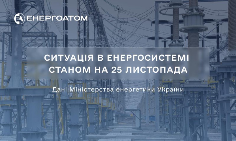 ℹ️Про ситуацію в українській енергосистемі станом на 2️⃣6️⃣ листопада читайте тут 25.11.2025, Вівторок | 12:52 Автор допису: Енергоатом ℹ️Про ситуацію в українській енергосистемі станом на 2️⃣6️⃣ листопада читайте тут #міністерство_енергетики EA |FB😎|YT📹|Х👥|IN🔗|IG🕊|TH🧵 Джерело Друк / PDF