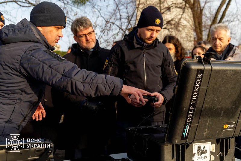 Під час візиту гостям продемонстрували роботу наземних і підводних роботизованих систем, можливості розмінування та гасіння пожеж роботами, а також роботу пересувного пункту управління ДСНС.