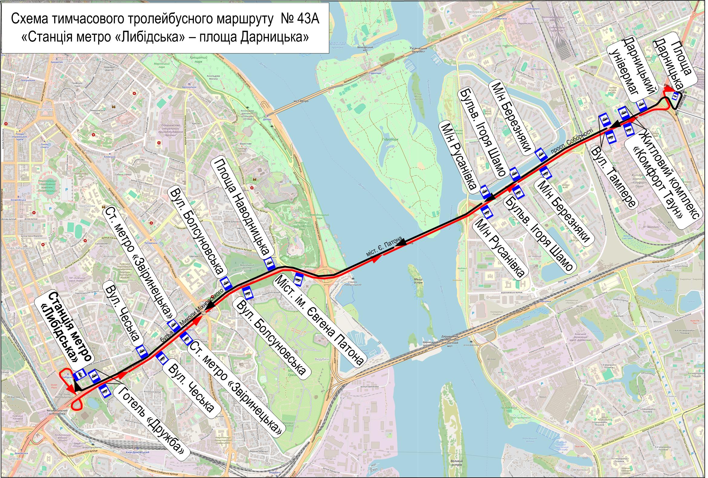 27 листопада через технічні роботи на шляхопроводі біля ст. м. «Дарниця» курсуватиме тимчасовий тролейбус № 43-А (+схема)