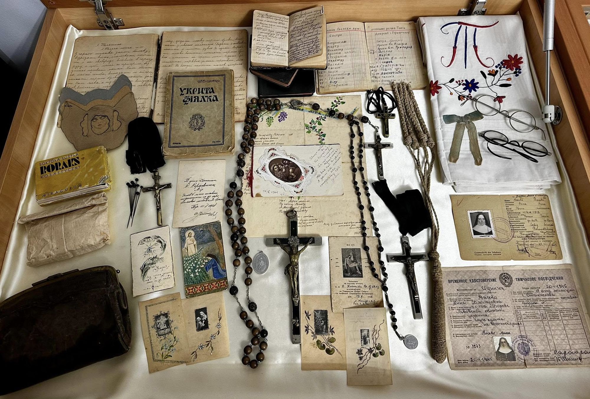 Серед найвражаючих експонатів — речі, якими користувалися підпільні священники: скляні чаші, дерев’яний хрестик із тайником для зберігання Пресвятої Євхаристії, посудинка від крему, у якій ховали священні дари, а також кишеньковий годинник, всередині якого священник у концтаборі заховав Євхаристію.