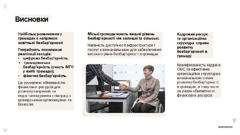 Результати показують: ми маємо хороший прогрес, але є сфери, які потребують посилення – передусім цифрова доступність, безбар’єрний простір і врахування потреб маломобільних людей. Особливо це стосується сільських та віддалених громад.