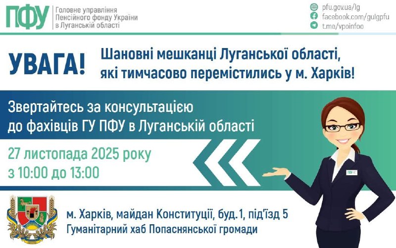 Завтра у Харкові – прийом пенсійників Луганщини 27 листопада у хабі Попаснянської громади відбудеться прийом… 26.11.2025, Середа | 14:21 Автор допису: Голова Луганської обласної військової адміністрації Завтра у Харкові – прийом пенсійників Луганщини27 листопада у хабі Попаснянської громади відбудеться прийом ВПО фахівцем ГУ ПФУ в Луганській області. Із 10:00 до 13:00 звертайтеся за адресою: м. Харків, майдан Конституції, буд. 1, під’їзд 5. Джерело Друк / PDF