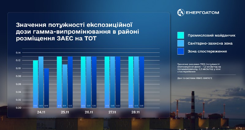 З 24 по 28 листопада 2025 року потужність експозиційної дози гамма-випромінювання в районі розміщення Запорізької АЕС на тимчасово окупованих територіях України відповідала чинним нормам.