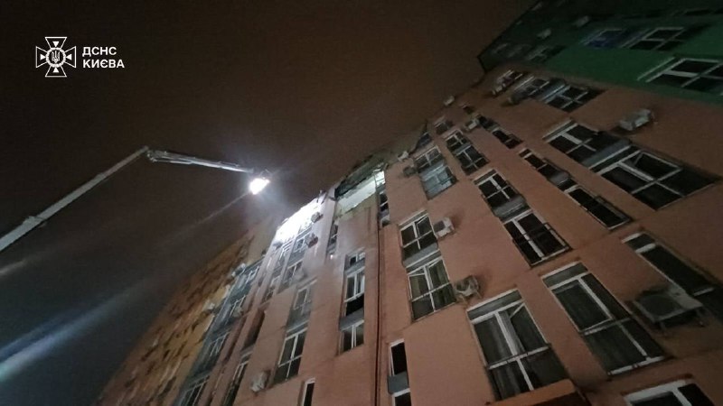 🔴Дніпровський район: влучання у 10-поверховий житловий будинок спричинило руйнування 6-7 поверхів. Пожежу ліквідовано. З 7 поверху врятовано 3 людей, серед них маломобільна особа. Триває розбір конструкцій.