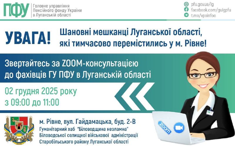 2 грудня з 9:00 до 11:00 у гуманітарному хабі Біловодської громади відбудеться онлайн консультування з пенсійних питань від фахівця Головного управління Пенсійного фонду України в Луганській області.