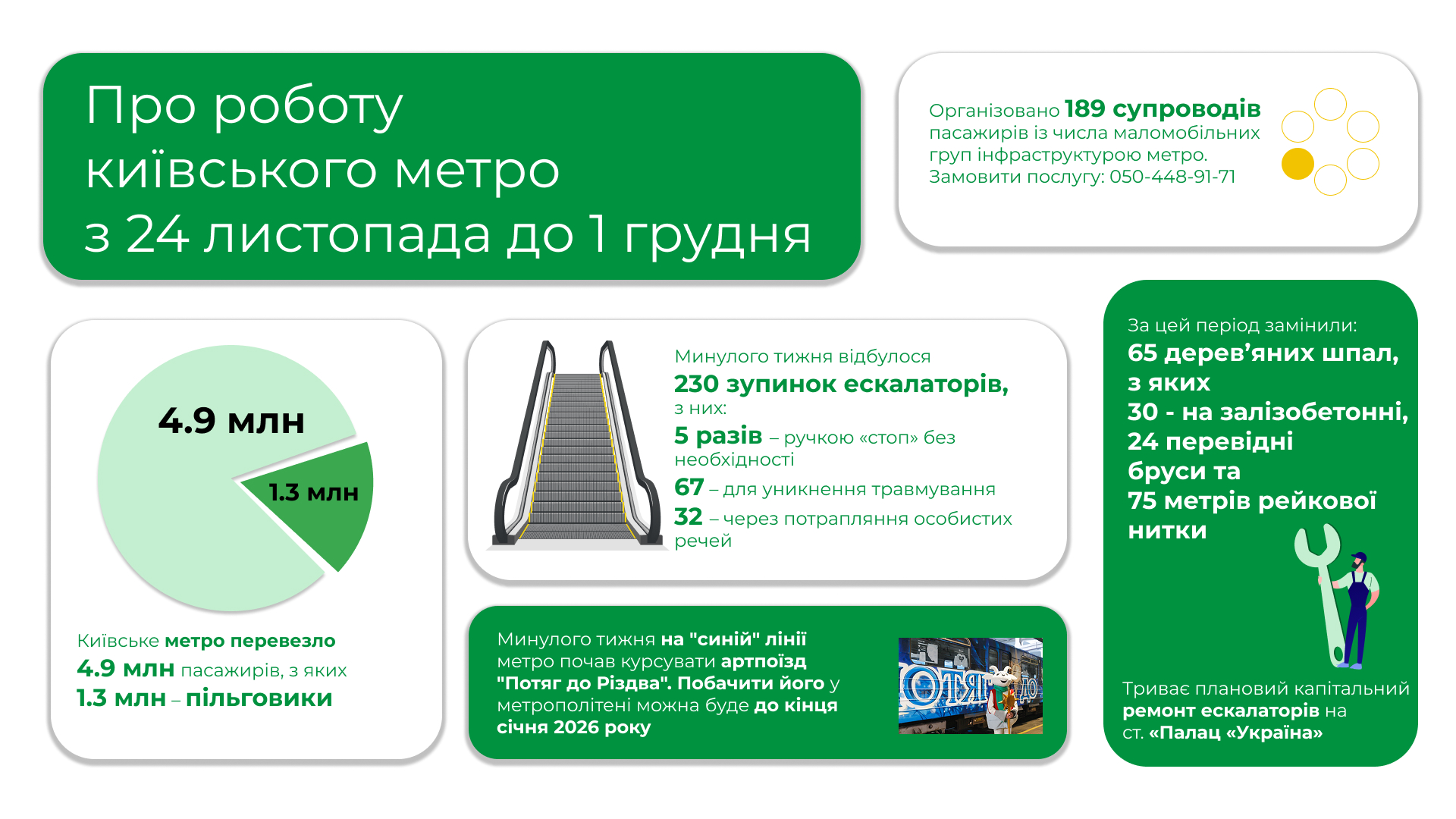 У цей період також фахівці організували 189 супроводів пасажирів із числа маломобільних груп інфраструктурою метрополітену. Нагадаємо, що для замовлення супроводу необхідно зателефонувати за номером (044) 238-55-11 або 050-448-91-71 та повідомити маршрут поїздки в метрополітені. У підприємстві рекомендують телефонувати за годину до запланованої поїздки, аби працівник метро очікував біля початкової станції.