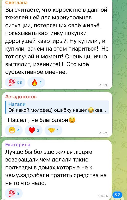 "Ви вважаєте, що коректно у даній найтяжчій для маріупольців ситуації, які втратили своє житло, показувати картинку покупки дорогої квартири…дуже цинічно"