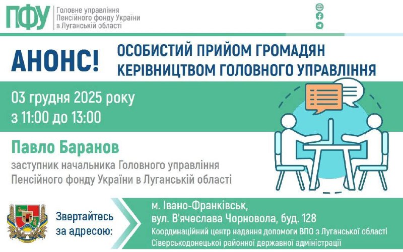 3 грудня у місцевому хабі Сіверськодонецької РДА відбудеться особистий прийом заступника начальника Головного управління Пенсійного фонду України в Луганській області Павла Баранова.