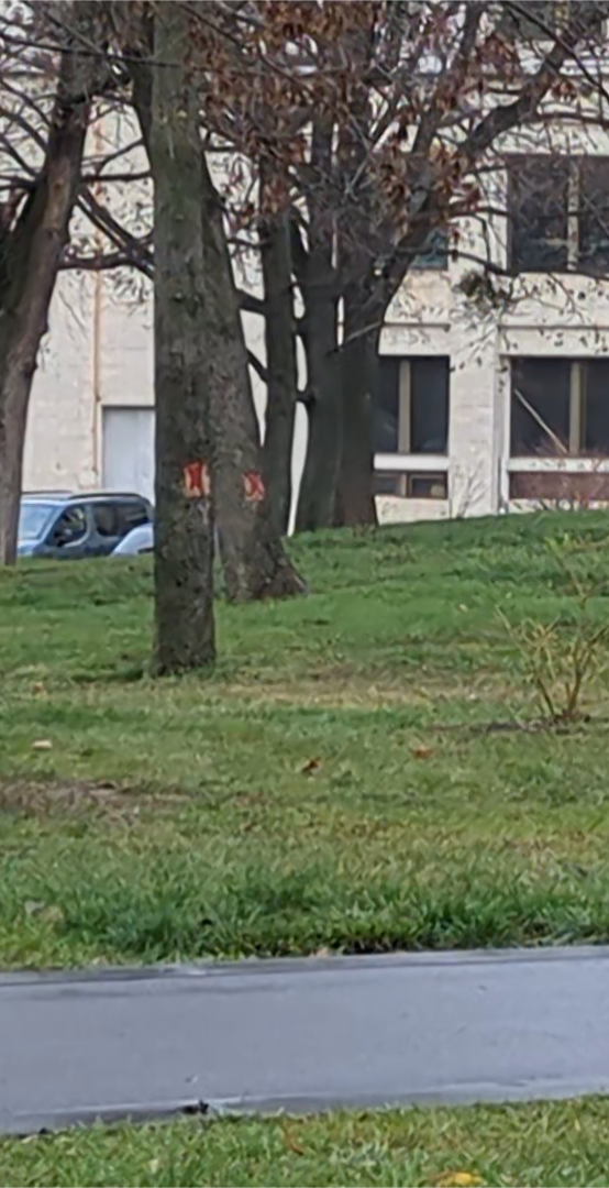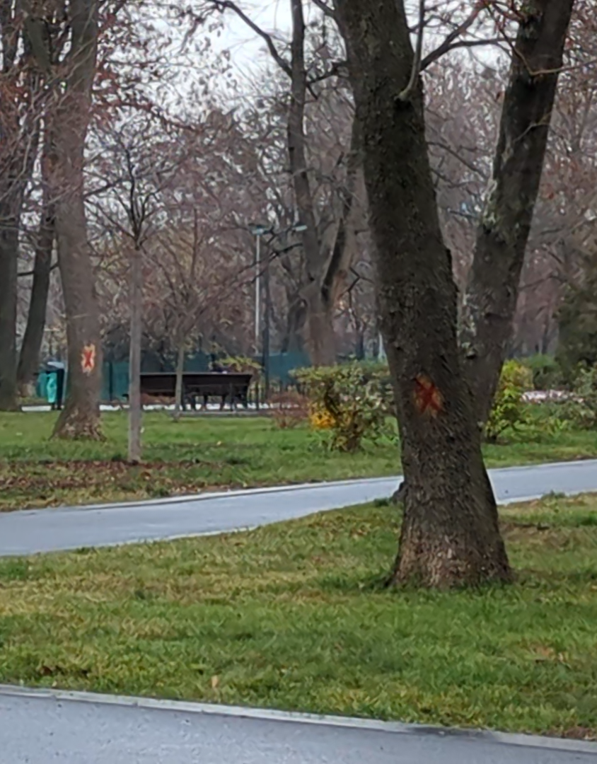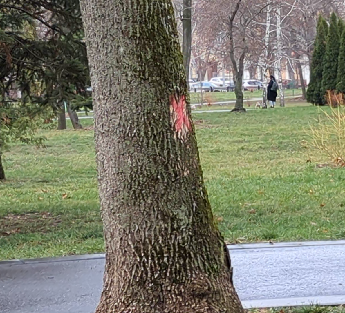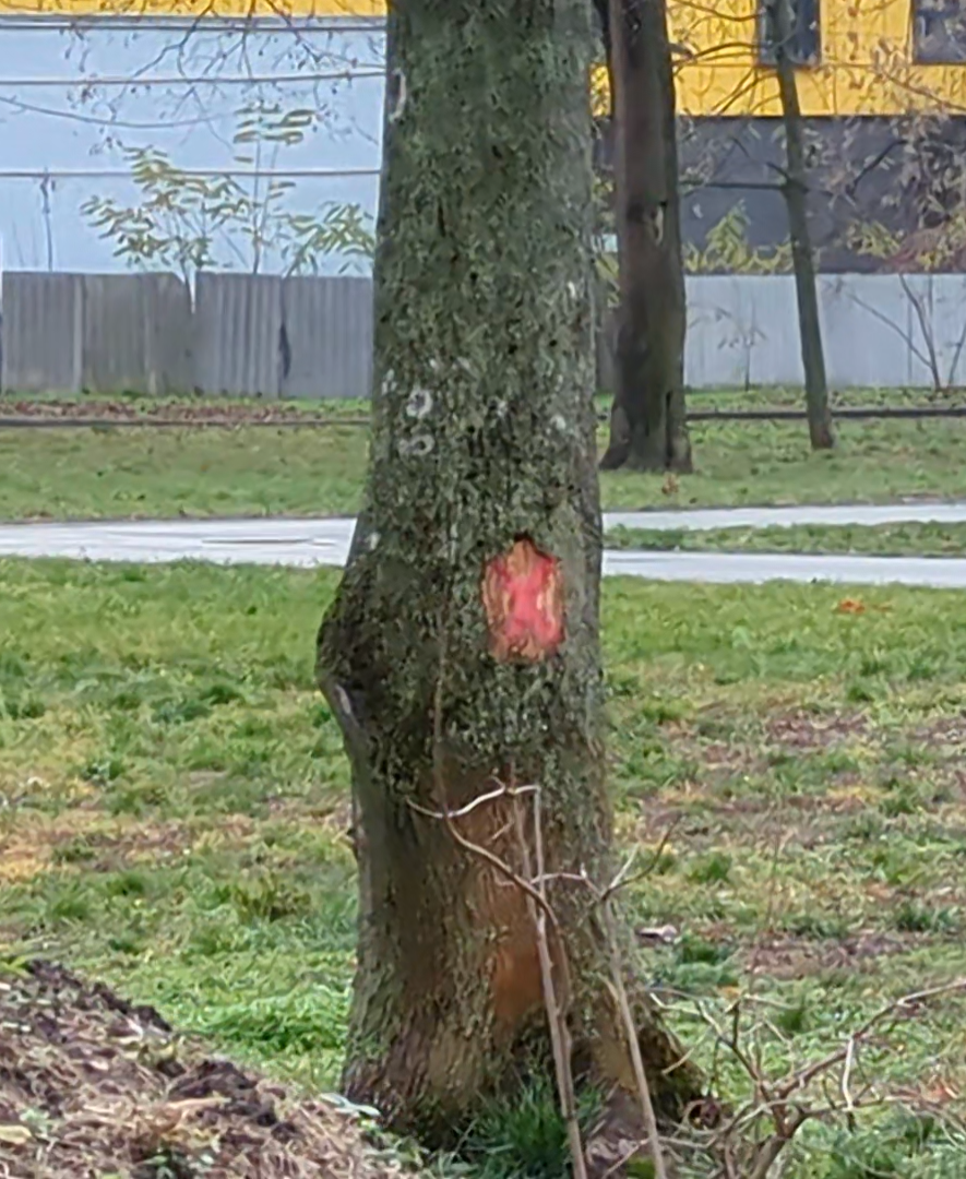 Зазначимо, що нещодавно десятки дорослих дерев, серед яких значна частина є живими та здоровими, були позначені спеціальними червоними відмітками для вирубки.