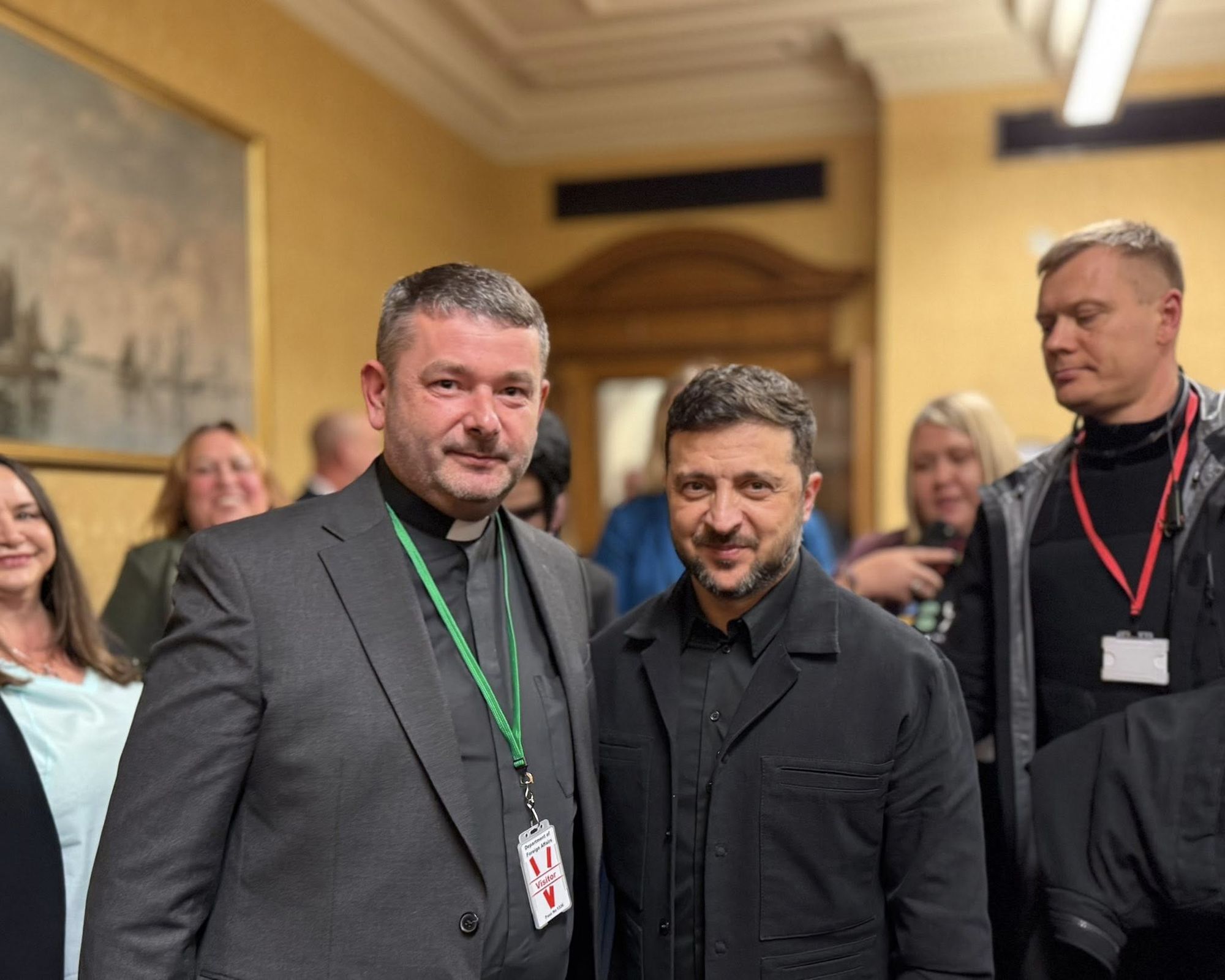Президент і Перша леді поспілкувалися з лідерами українських організацій, студентами та активістами. На заході були присутні також представники Української Греко-Католицької Церкви в Ірландії — о. Василь, священник парафії Блаженного священномученика Миколая Чарнецького, та секретар парафії Олександр.