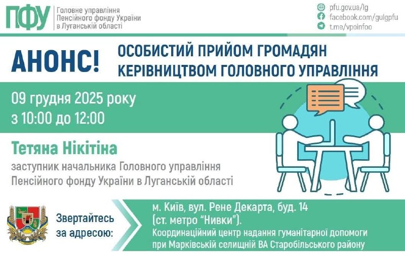 9 грудня там відбудеться особистий прийом заступника начальника Головного управління Пенсійного фонду України в Луганській області Тетяни Нікітіної.