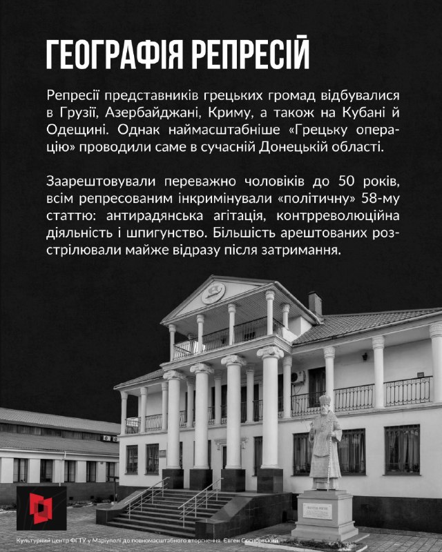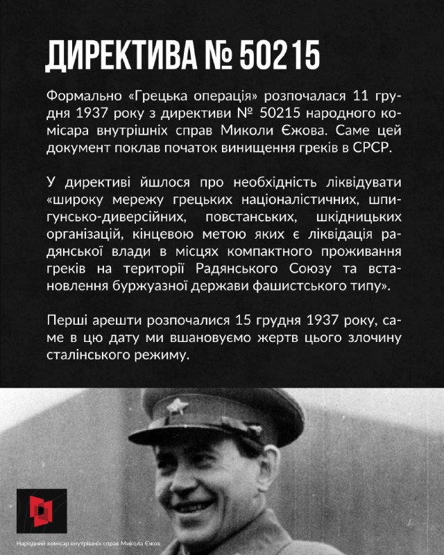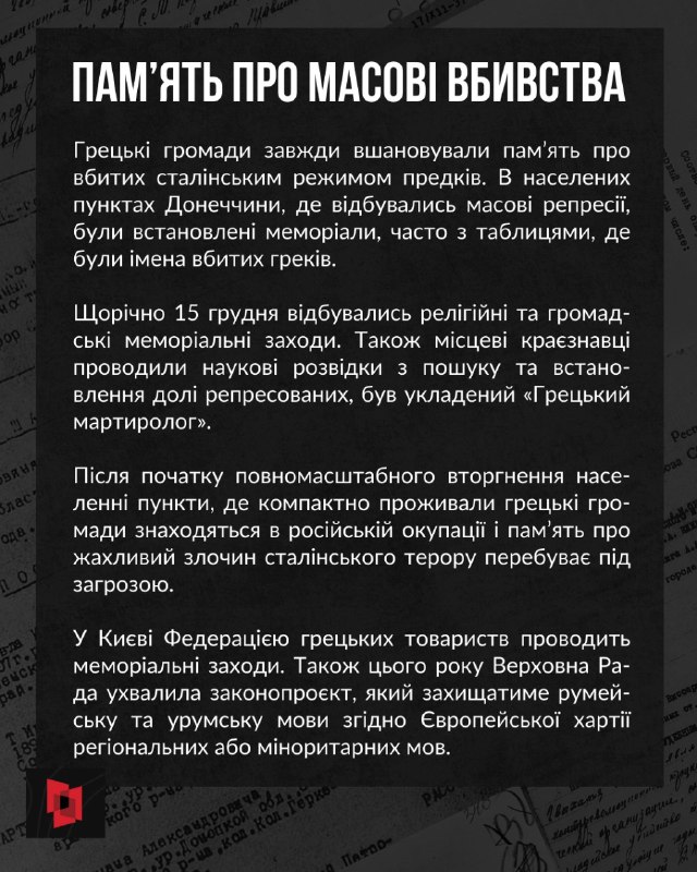 15 грудня ми вшановуємо жертв «Грецької операції» НКВД, у межах якої совєцька влада масово репресувала представників грецьких громад, насамперед у Приазов’ї та на Кавказі.