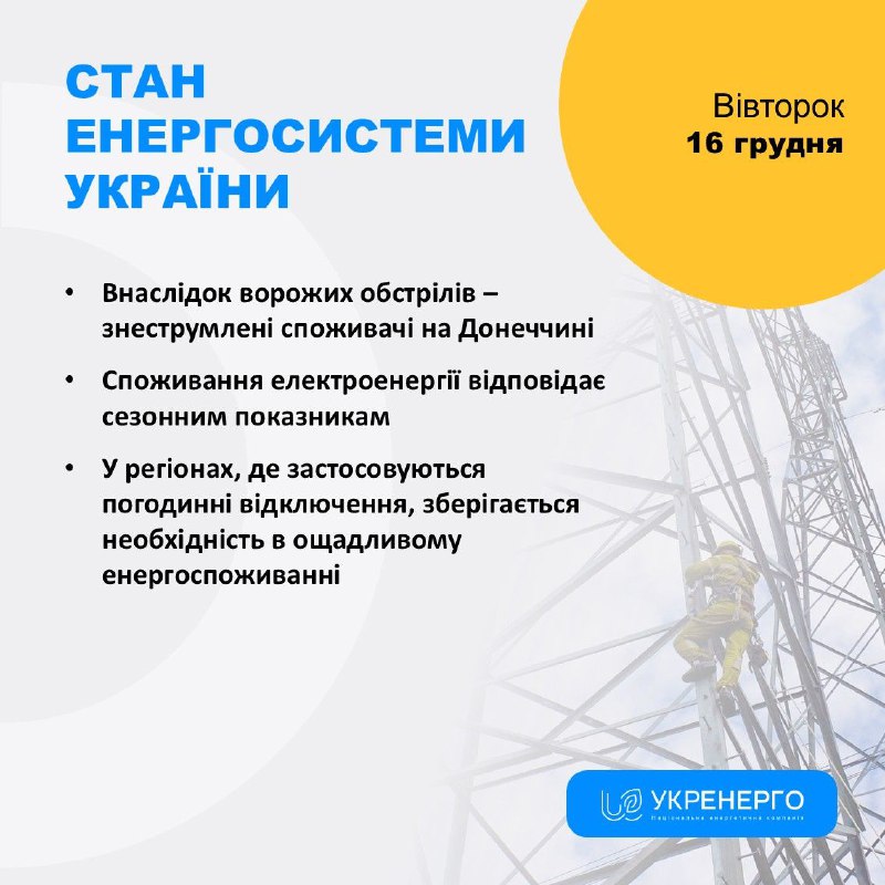 Споживання електроенергії тримається на рівні, що відповідає сезонним показникам. Сьогодні, 16 грудня, станом на 9:30, його рівень був таким же, як в цей час попереднього дня – у понеділок.