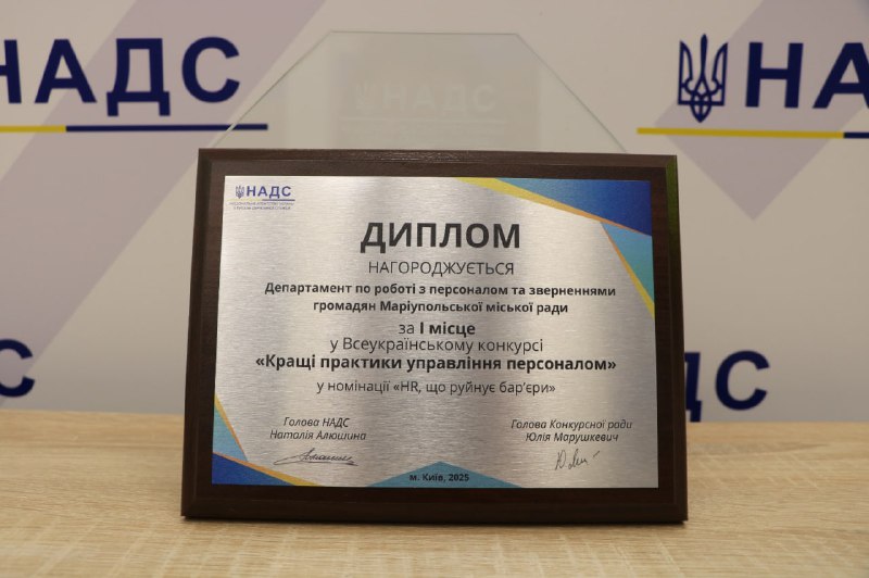 🇺🇦У Києві нагородили переможців Всеукраїнського конкурсу "Кращі практики управління персоналом", який проводило Національне агентство України з питань державної служби. Департамент по роботі з персоналом та зверненнями громадян Маріупольської міської ради посів перше місце в номінації "HR, що руйнує барʼєри".