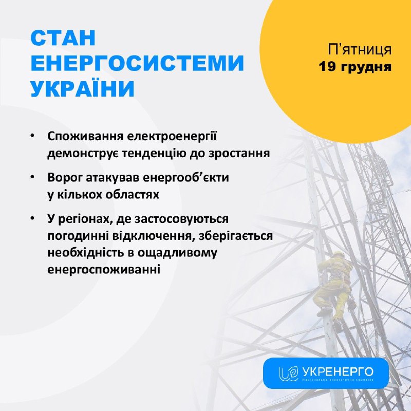 Споживання електроенергії демонструє тенденцію до зростання. Сьогодні, 19 грудня, станом на 9:30, його рівень був на 1,9% вищим, ніж в цей час попереднього дня – у четвер. Причина – зниження температури повітря у більшості регіонів України.
