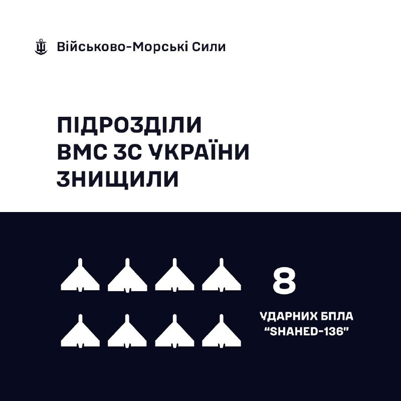 За минулу добу, під час повітряних атак російських окупантів, силами та засобами Військово-Морських Сил Збройних Сил України у складі угруповань було збито 8 ударних БпЛА типу «SHAHED-136».