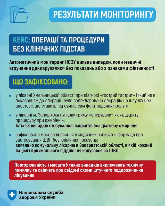 ➡️ На сайті НСЗУ опубліковано результати автоматичного моніторингу, який проводиться суцільним методом та охоплює усі заклади охорони здоров’я, які законтрактовані за пакетами медичної допомоги «Хірургічні операції дорослим та дітям у стаціонарних умовах», «Стаціонарна допомога дорослим та дітям без проведення хірургічних операцій» та «Хірургічні операції дорослим і дітям в умовах стаціонару одного дня».