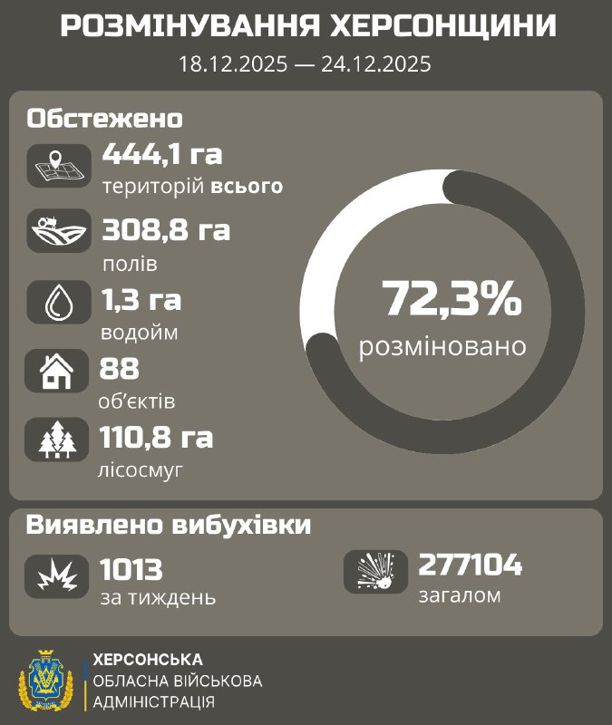 ⚠ Ще понад 400 гектарів правобережжя Херсонщини – очищено саперами від російської вибухівки. 26.12.2025, П’ятниця | 19:54 Автор допису: Херсонська обласна військова адміністрація ⚠ Ще понад 400 гектарів правобережжя Херсонщини – очищено саперами від російської вибухівки. Динаміка розмінування – на інфографіці 👆 Джерело Друк / PDF