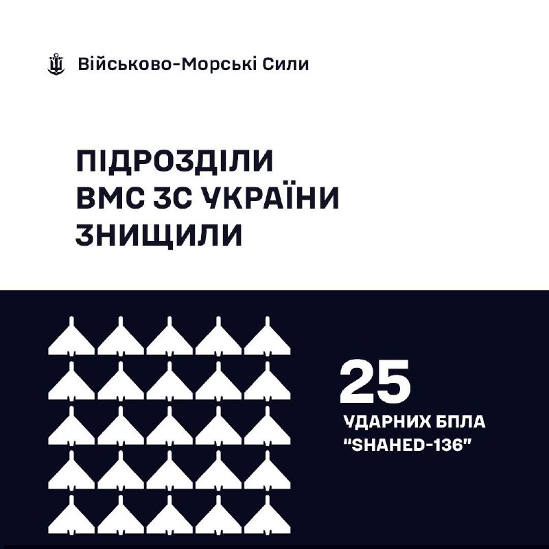 За минулу добу, станом на 06:00 26.12.2025, силами та засобами Військово-Морських Сил Збройних Сил України у складі угруповань було збито 25 ударних БпЛА типу «SHAHED-136».