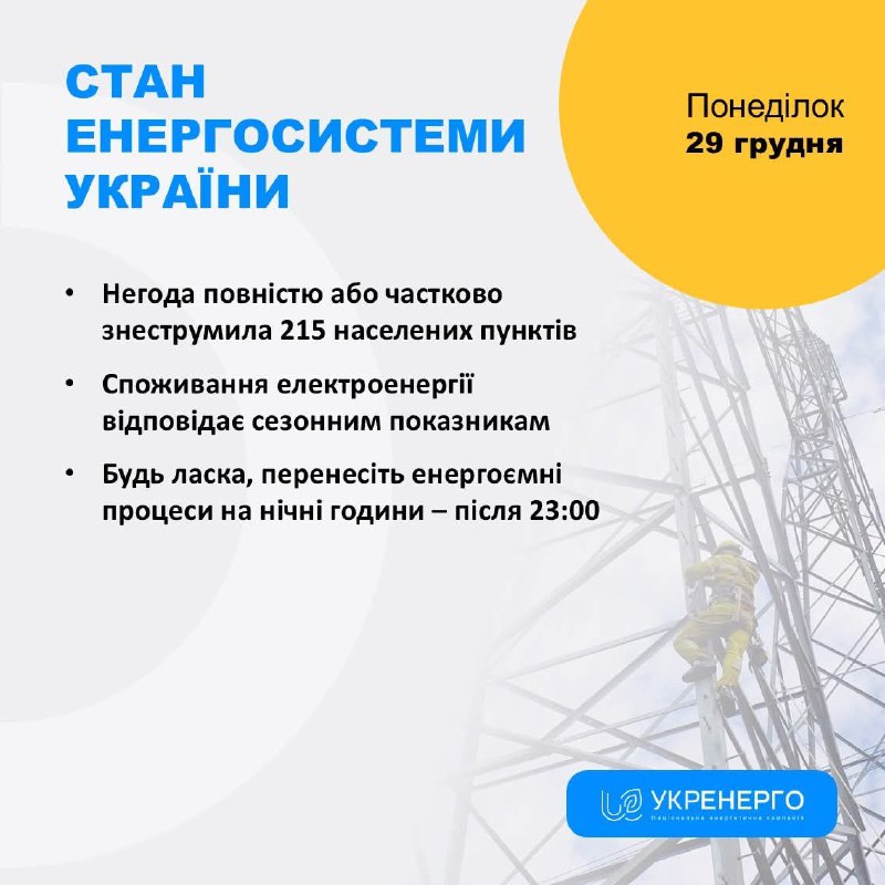 СТАН ЕНЕРГОСИСТЕМИ 🔹Негода повністю або частково знеструмила 215 населених пунктів