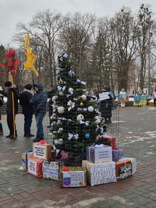 🎄🥺У Вінниці організували перформанс "Ялинка Надії". Дерево имволічно поставили за імітованими ґратами та колючим дротом. Ялинку прикрасили кульками з побажаннями захисникам якнайшвидше повернутися додому, а також світлинами захисників.