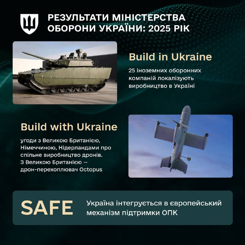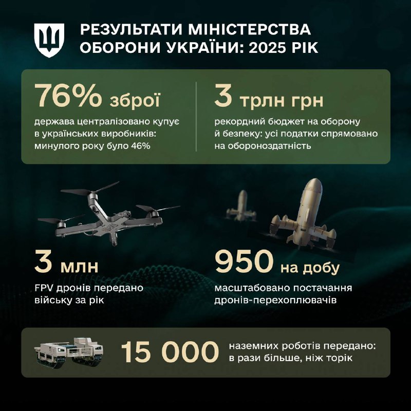 🔹 Більше української зброї на фронті. 76% всього, що централізовано купує держава, вона купує в українських зброярів. Майже кожен дрон на фронті – українського виробництва. У 2025 поставили у військо рекордну кількість FPV дронів і почали масові поставки наземних роботів та дронів-перехоплювачів.