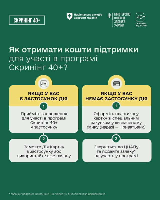 1️⃣ Запрошення на скринінг надійде у застосунок Дія на 30-й день після дня народження (для всіх громадян віком від 40 років).