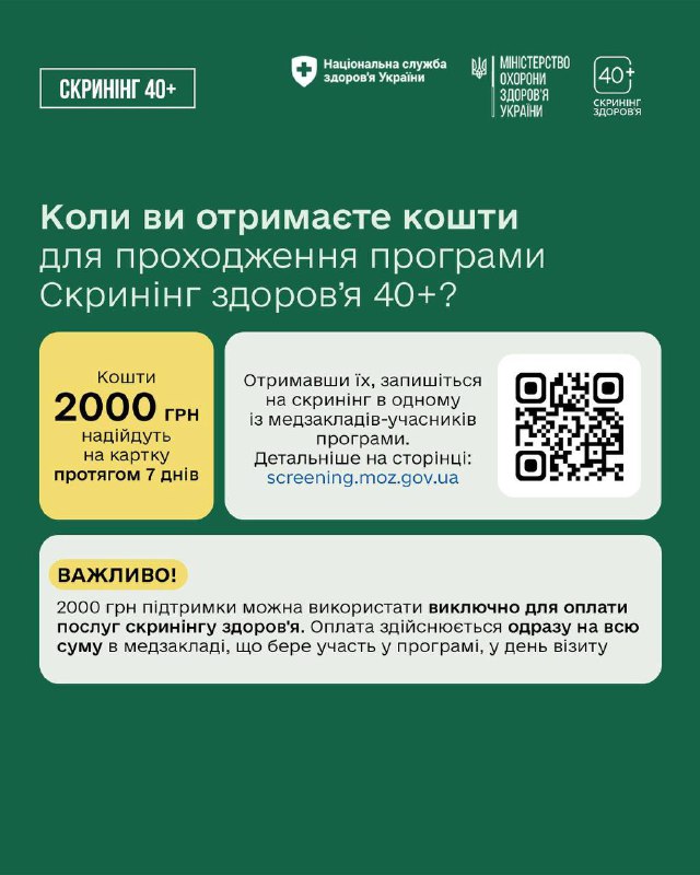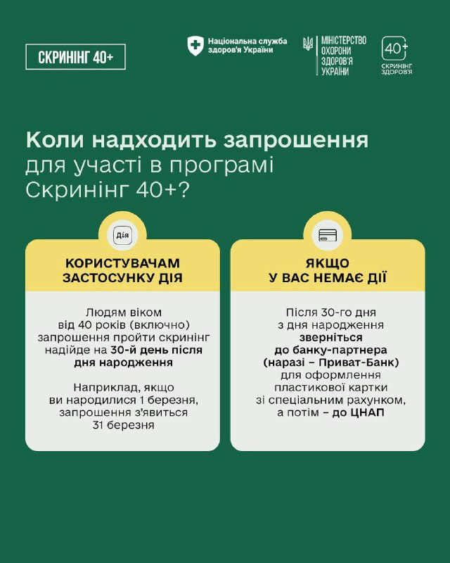 ℹ️ За допомогою програми Скринінг здоровʼя 40+ мільйони українців матимуть змогу пройти обстеження на раннє виявлення серцево-судинних захворювань, цукрового діабету і проблем психічного здоровʼя. Вже наприкінці січня перші пацієнти почнуть отримувати запрошення на скринінг.