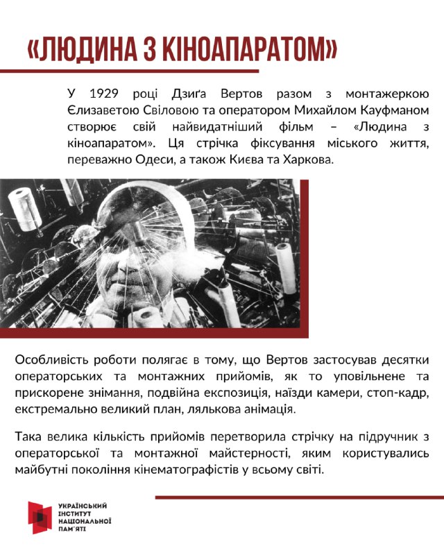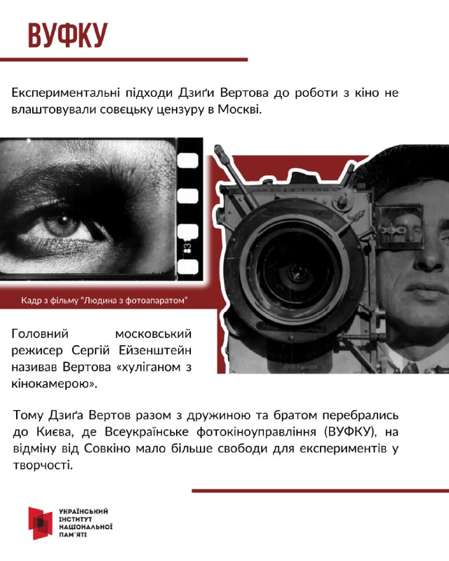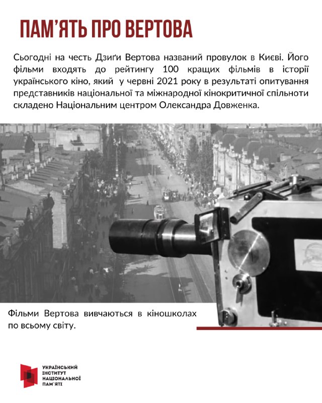 Саме його ім’я пов’язують з утворенням українського кіноавангарду та документального кіно. Вертов створив перший звуковий фільм в українському кінематографі – «Ентузіязм. Симфонія Донбасу».