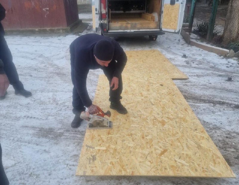Лише впродовж сьогоднішнього дня вони працювали за вісьмома адресами. Там перекрито 75 вибитих вікон і 2 двері.