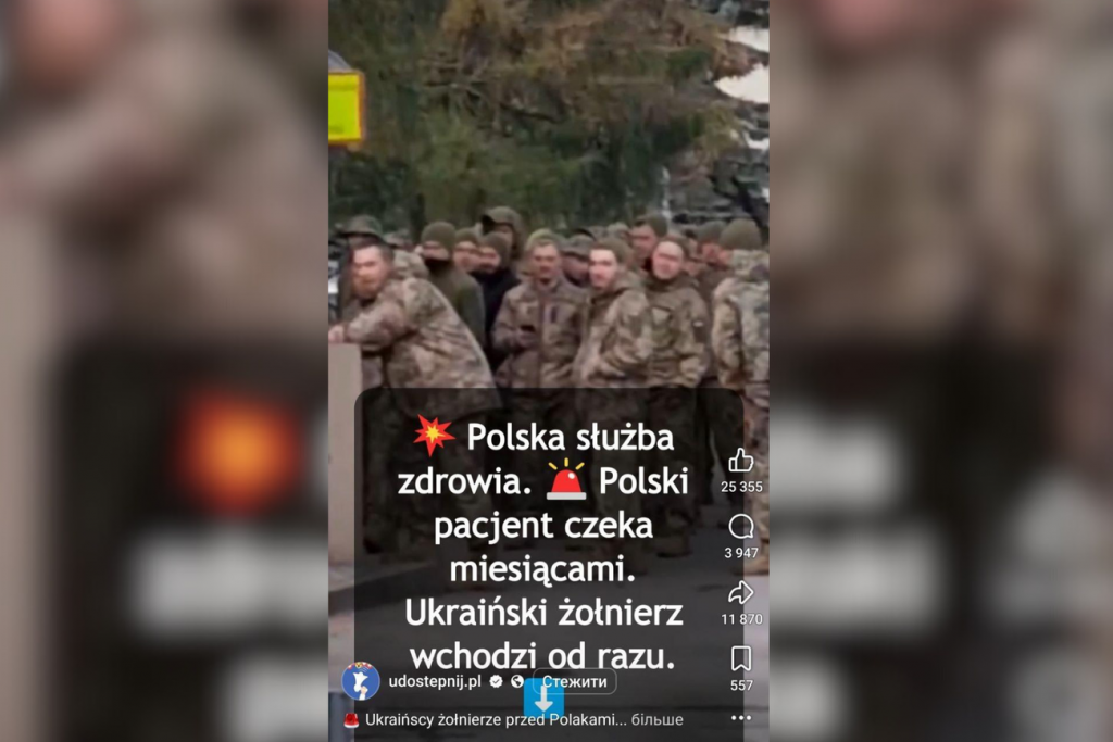 Але цьогоріч маніпулятори випустили «новий сезон» популярного наративу і вкинули фейк про те, що нібито українські солдати мають перевагу над поляками в отриманні медичної допомоги в польських лікарнях. Фейк виник після поширення відео, знятого біля лікарні у Стальовій Волі, де тривали навчання, зокрема з медицини поля бою. Міноборони Польщі, яке у цій програмі задіяне, списало це на російську пропаганду, щоб розпалювати емоції і поляризувати суспільство. Відео лише з однієї сторінки репостнули 11 тисяч разів, воно отримало понад 1 млн переглядів і 4 тисячі коментарів, які чутливим до ненависницьких меседжів краще не читати.
