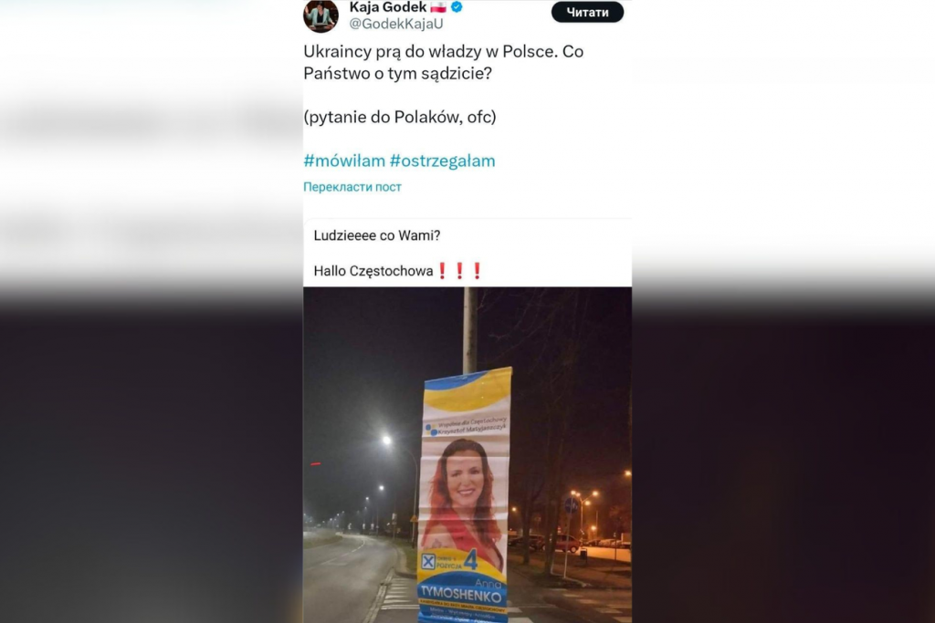 «Українці намагаються захопити польську владу», – на сполох била польська активістка Годек. Вона поширювала у соцмережах повідомлення, що владу у Ченстохові на місцевих виборах хоче завоювати Анна Тимошенко під жовто-блакитними прапорами. Цю інформацію дуже швидко підхопили медіа та телеграм-канали сумнівного походження.