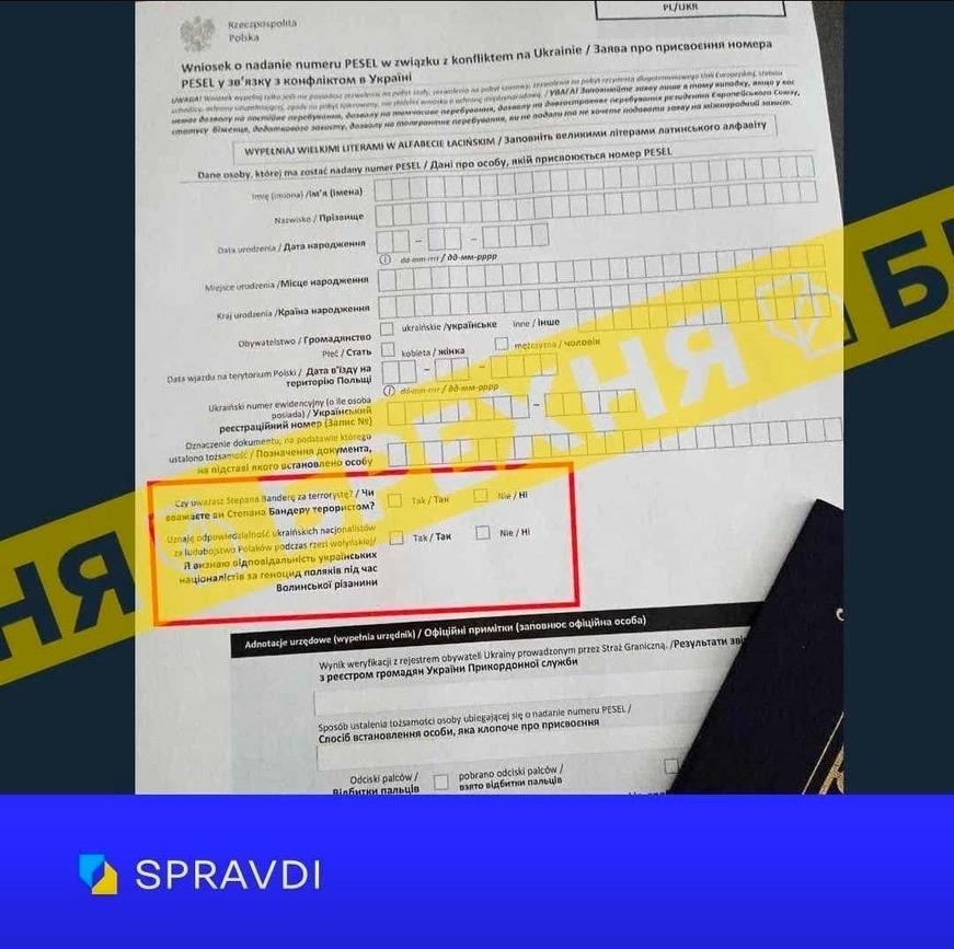 Ну і як же без Волині? У соцмережах вірусилися фейкові бланки начебто під час оформлення польського ідентифікаційного номера PESEL українців змушують відповідати на питання «Чи вважаєте ви Степана Бандеру терористом?» та «Чи визнаєте ви геноцид поляків під час Волинської різанини?» У Центрі стратегічних комунікацій та інформаційної безпеки спростували цю інформацію. Історична тема улюблена у багатьох польських політиків, починаючи з президента, а також в топі постійних кремлівських «підгонів».