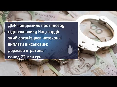 Працівники Державного бюро розслідувань викрили підполковника Національної гвардії України, який організував незаконні виплати військовослужбовцям у розмірі 100 тисяч гривень. Внаслідок цих дій державі завдано збитків на понад 72 мільйони гривень.