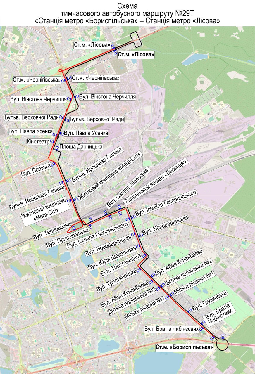 - 29т – ст. м. «Бориспільська» – ст. м. «Лісова».